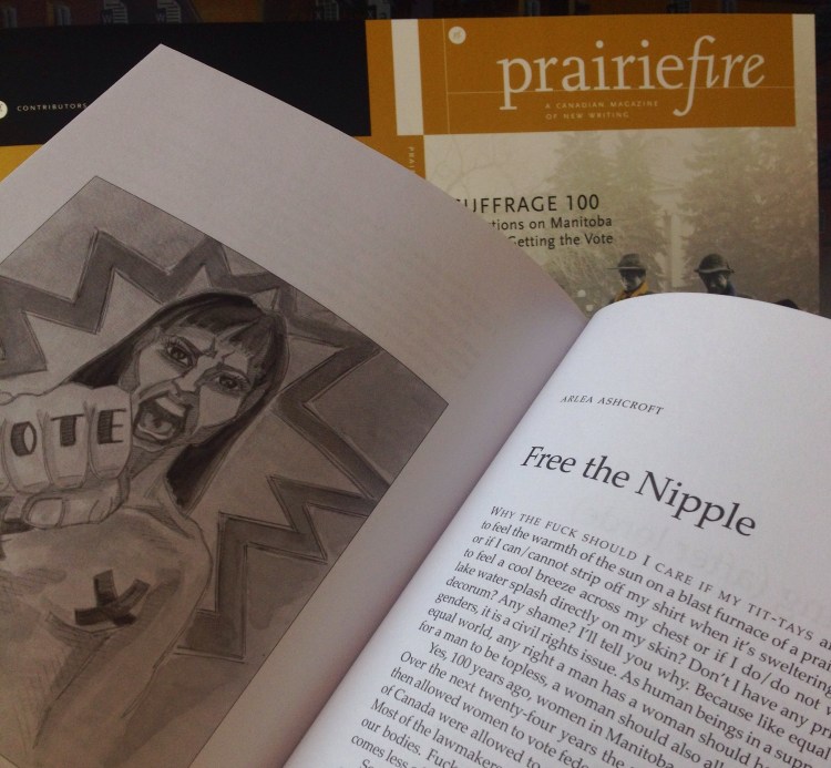 I sent in the piece and then was asked to write about it. Hmmm I don’t often write about my work. I was thinking about women’s rights and all that has transpired in the past 100 years. I ended up composing a rant. A rant about Freeing Our Nipples. It’s a page long it’s literary it’s published. It’s kind of a bummer the image isn’t in colour. But fuck it. Here’s a pic of the piece for you to peruse.