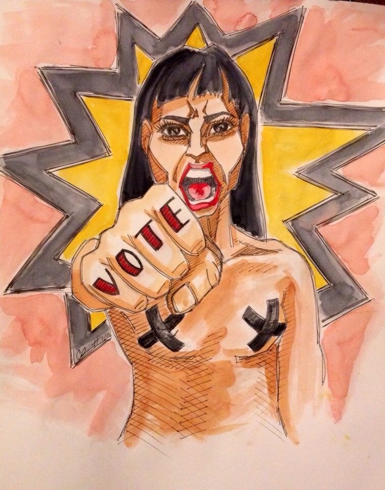 I pondered for a while lit candles, incense put on some Concrete Blonde and Tanya Tagaq and let my mind go. The first image that came to me was this one. She’s watercolour ink and Copic marker on paper. 14″ x17″.