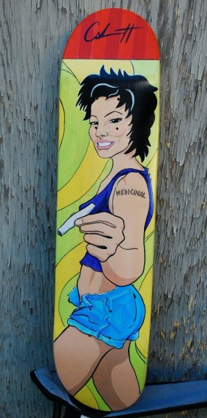 Previous Image Next Image Medicinal Medicinal – Acrylic on Skateboard Deck – Donoated to Kids Help Phone Fundraiser